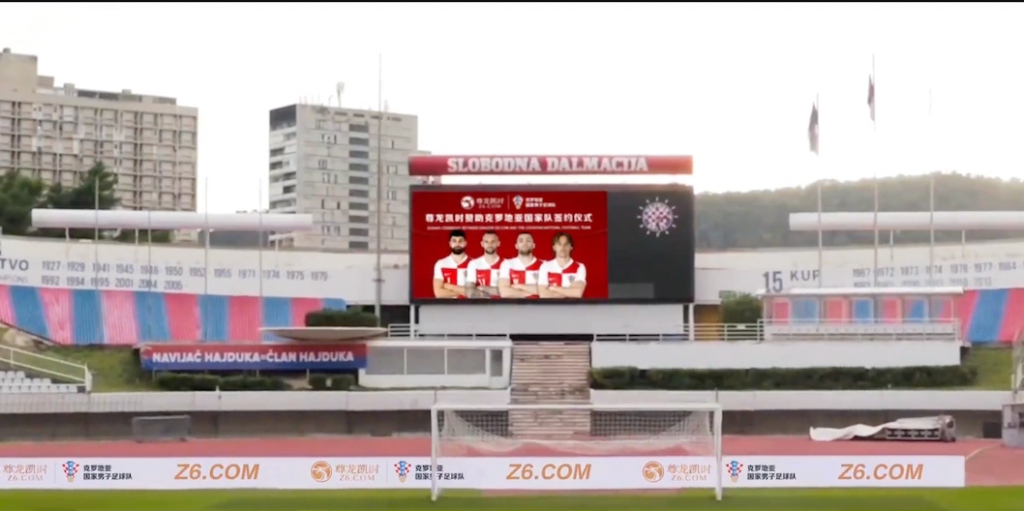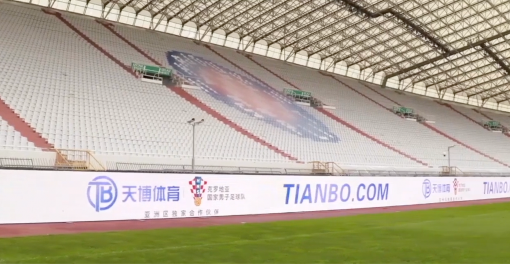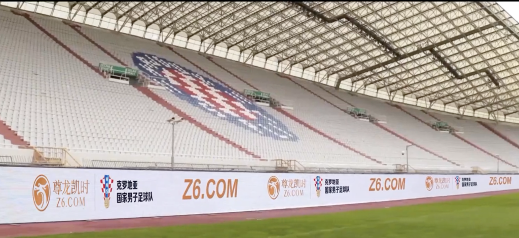 KashBet may also have had links with another brand, Tianbo[.]com, the Croatian national team’s betting partner from 2020 to 2022. This suspicion is reinforced by the striking resemblance between shots of the Poljud Stadium, the home of the Croatian national team in Split, in videos celebrating the “signing ceremonies” of both operators, as can be seen below.