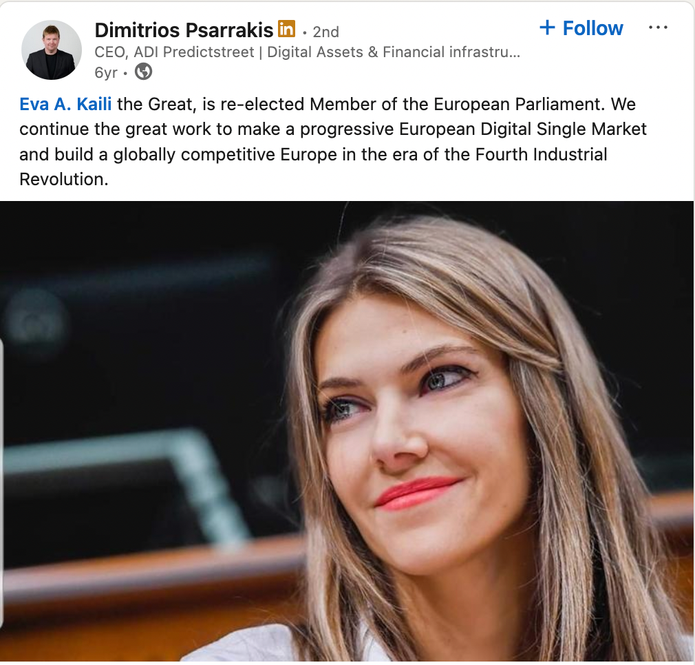 Adi Predictstreet offered the following statement: “Dimitrios served as Economic and Monetary Policy Specialist at the European Parliament from 2014 to 2021. In this capacity, he co-drafted most of the Digital Finance Regulations of the EU. He collaborated with MP Eva Kaili until 2021, prior to her arrest. Dimitrios has never been charged with any wrongdoing. Today, he remains a globally recognized blockchain expert and a speaker at top-tier universities, international organizations (such as the European Parliament and the World Economic Forum), as well as professional summits on FinTech, RegTech, Blockchain and the Digital Disruption of Banking and Financial Services around the globe. Additionally, he retains board and academic roles Global Blockchain Business Council and The Wharton School.“