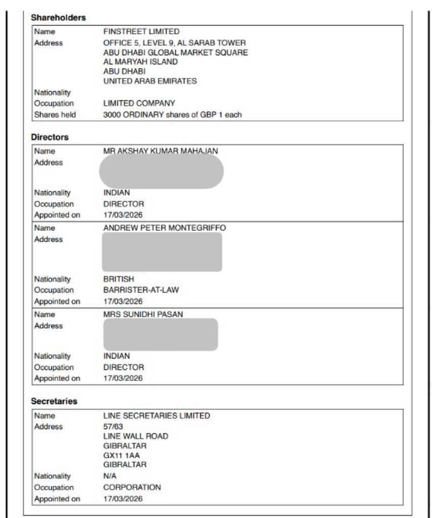 Two of Predict Street Limited’s directors are UAE residents: Akshay Kumar Mahajan, Strategy Director at Sirius Holdings and, according to his LinkedIn profile, “co-founder” of Finstreet; and Sunidhi Pasan, who co-founded Finstreet with him and is now CEO of the company. Finstreet is Predict Street Limited’s parent company and is part of the business empire of Abu Dhabi’s royal family, the company’s ultimate owners. The third director is Gibraltar resident Andrew Peter Montegriffo.