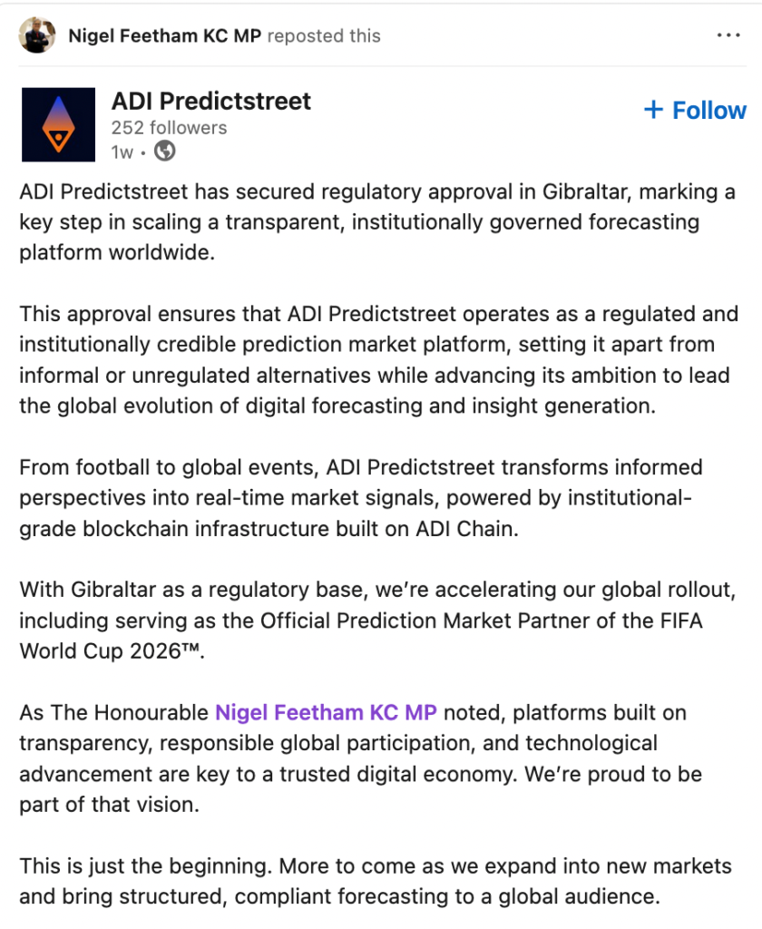 Nigel Feetham’s re-post of a Predictstreet post celebrating “a key step in scaling a transparent, institutionally governed forecasting platform worldwide”