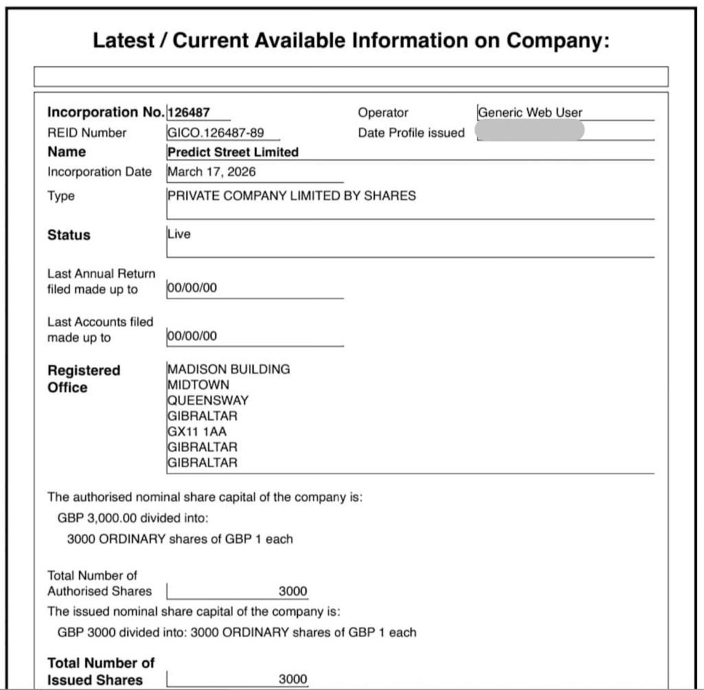 Josimar accessed the company formation documents of Predict Street Limited, the firm that operates Predictstreet and is the Gibraltar licence holder. According to these records, Predict Street Limited was incorporated on 17 March, a mere nine days before Feetham granted the company its gambling licence. This represents an exceptionally short period between corporate inception and regulatory approval.